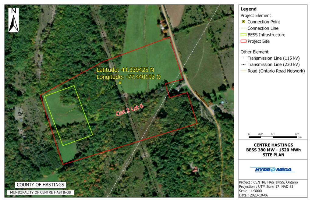 The Centre Hastings Battery Energy Storage System project (‘’Centre Hastings BESS’’) that is under development is located in the Municipality of Centre Hastings within Hastings County, in the province of Ontario. This project will be submitted by Hydromega Services Inc. (the ‘’Proponent’’) as part of IESO Long-Term 1 Request for Proposals (‘’LT1 RFP’’). Should a potential partnership be formed at a later date between the current Proponent and local groups for the project, Hydromega Services Inc. would advise of the name change.